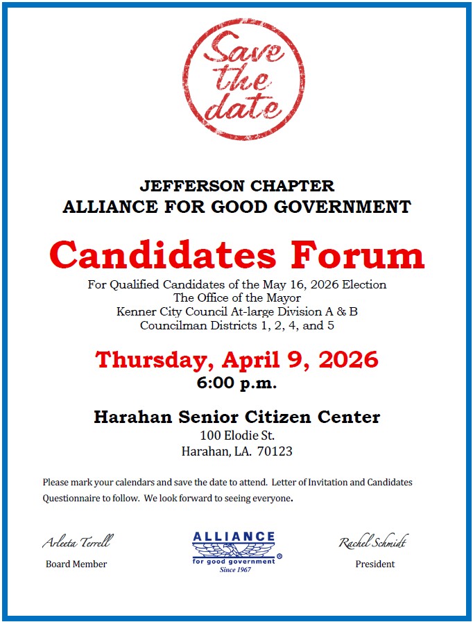 The Jefferson Chapter of The Alliance for Good Government encourages all registered voters to participate in the upcoming elections for political candidates seeking office in Jefferson Parish.